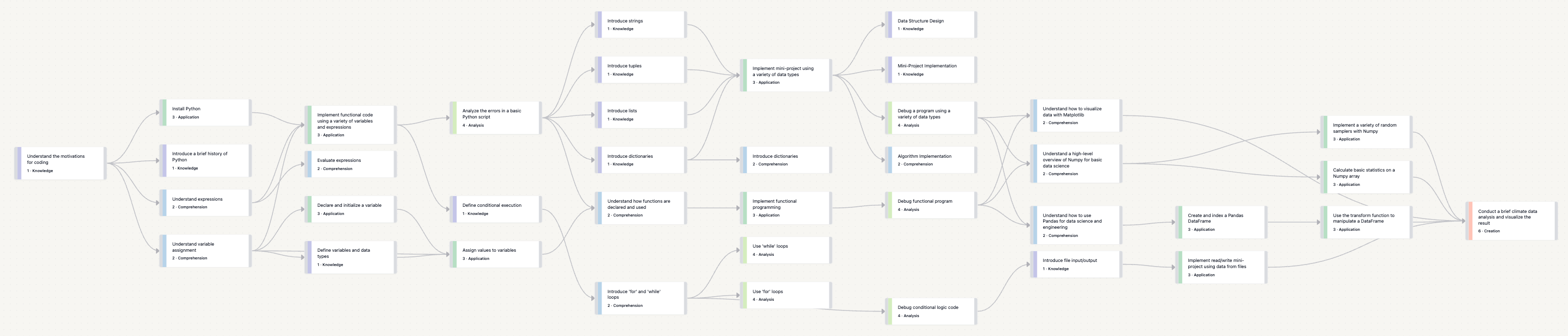 You can probably see where this is going: in Bloom’s taxonomy, you can start from the higher-level skills and work backward to derive the lower-level skills. If your goal is at the top of the pyramid—say, “Improvise dishes of Mexican cuisine from what’s in your fridge”—then you can break this into parts, defining the foundational concepts and abilities required to support it. This essentially creates a “dependency graph” or skill tree4 specifying the progression of knowledge and abilities needed to achieve the final goal.