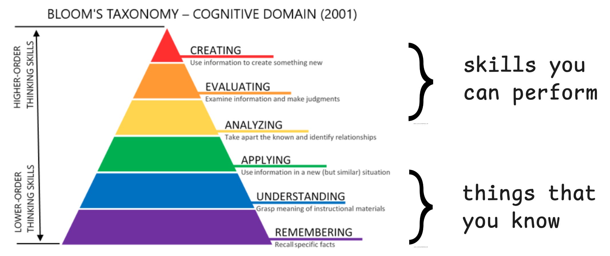 Our inspiration here came from Benjamin Bloom (the same Bloom of the eponymous two sigma problem), whose seminal work on frameworks in education included various taxonomies of what people actually learn. His cognitive taxonomy shows how we might start from lower-order memorization of knowledge and build up to higher-order critical thinking skills: