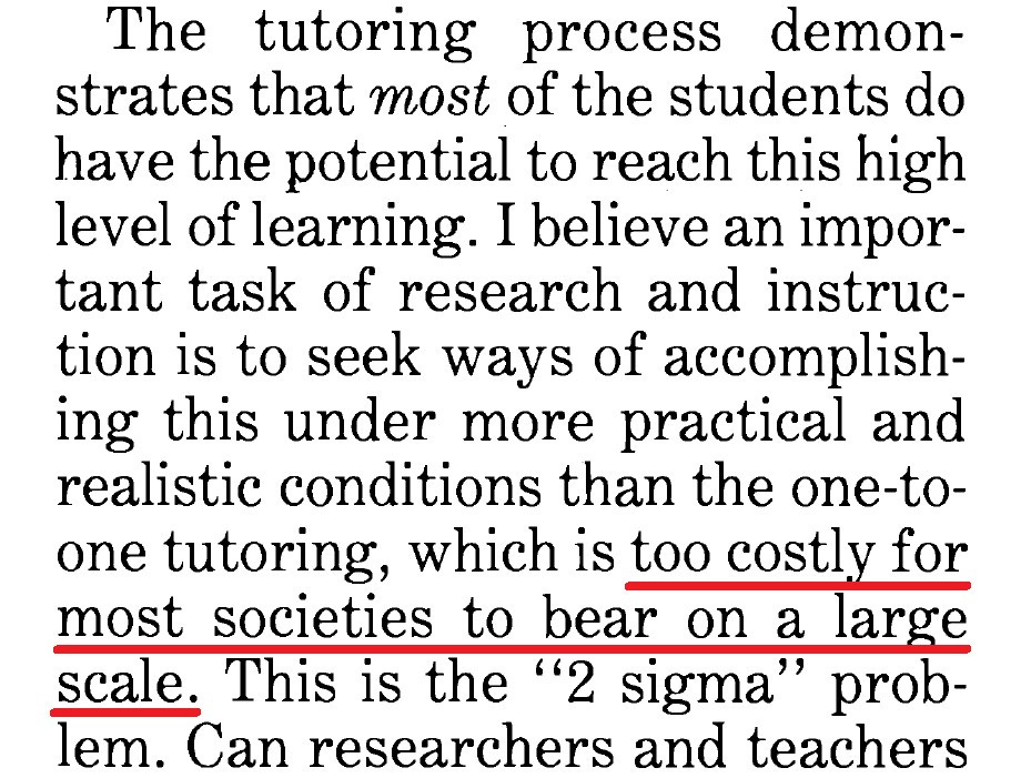 Bloom posited that the solution to the 2-sigma problem would need to be better methods of group instruction. But maybe he was wrong to assume that 1:1 tutoring wasnât scalable.