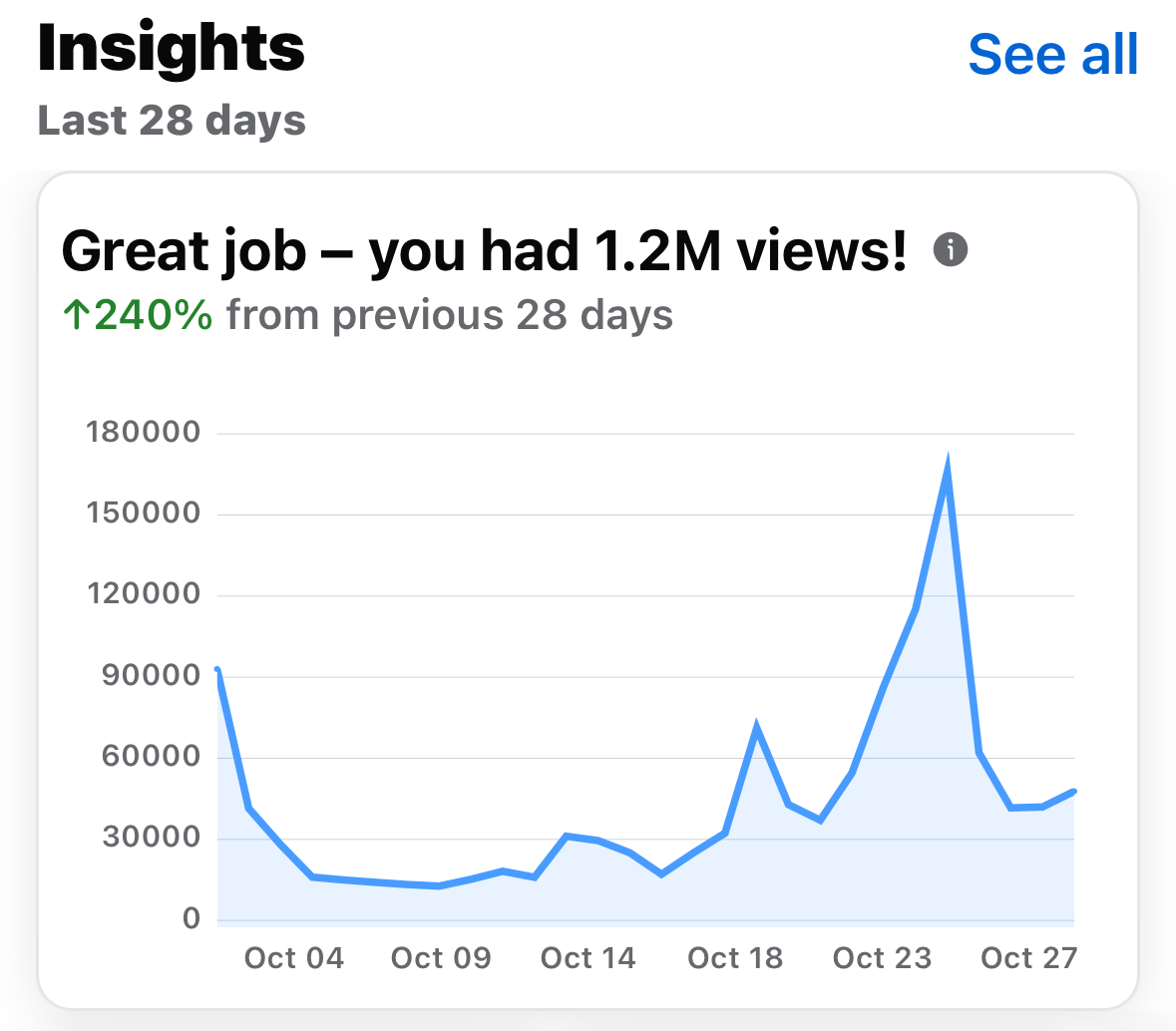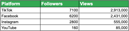 Initially, TikTok was our top performing platform. Surprisingly, however, Facebook became our top performer over the past 4 weeks. TikTok is notorious for having great reach (and itās known to boost new accounts), whereas Facebook usually takes a little more time to build credibility before the algorithm starts to push your posts. However, we were able drive over 1.7M views in November on Facebook alone.